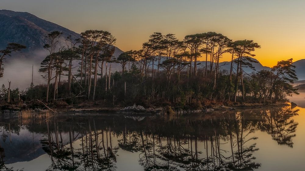 Het wereldberoemde pijnboomeiland in Connemara - Ierland in de vroege ochtend. Mist stijgt op uit het water en het eerste licht is zichtbaar. Wat een prachtig tafereel.