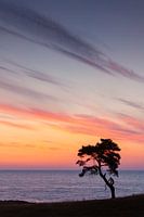 Eenzame grove den, Pinus sylvestris, aan de Baltische kust bij Haväng, Skåne, Zweden