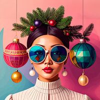 Een illustratie van een vrouw, met feestelijke kerstversiering op en rond haar hoofd. Zij draagt een grote ronde bril met spiegelglazen en aan weerszijden van haar hoofd hangen grote kleurige kerstballen. Het is december, kerst is begonnen. Het beeld is met behulp van ai gegenereerd.
