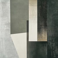 Depth Divisions - Dit abstracte schilderij kenmerkt zich door strakke geometrische vormen in een pallet van voornamelijk grijs- en aardetinten, onderbroken door een indringend zwart verticaal element dat een dynamische contrast creëert.