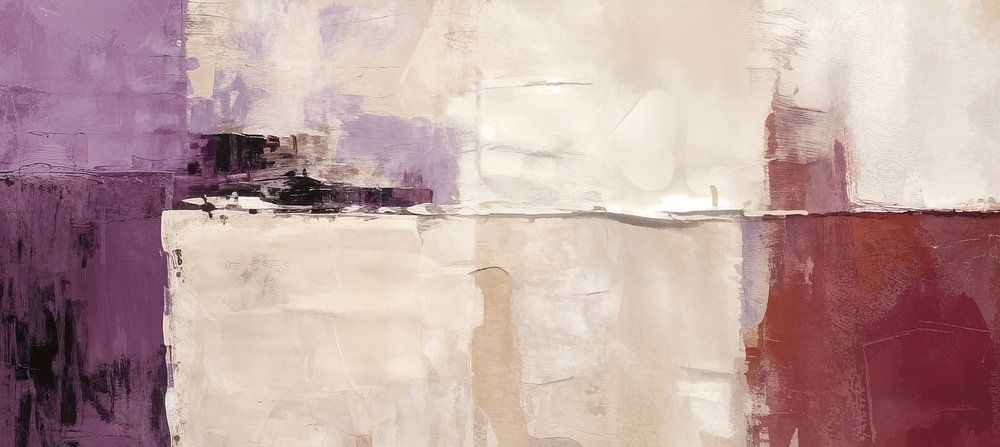 Depths of Mauve Tranquility - Dit abstracte schilderij kenmerkt zich door de evenwichtige, maar krachtige blokken van purper en crèmekleur met subtiele reflectie-effecten die diepte en beweging suggereren.