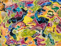 Dit abstracte schilderij, in de kleuren: blauw, oranje, roze, geel en groen, is onderdeel van een serie. Series vind ik fijn want zo blijf ik in een en dezelfde creatieve flow. Het is een monotype, een eenmalig drukwerk. Elke print is zodoende uniek, het kan niet worden herhaald. Tijdens dit creatieve proces laat ik me leiden door de reeds aanwezige elementen en mijn gevoel. Ik heb hier in de afdruk verder gewerkt met pastelkrijt en Oost-Indische inkt. Pas wanneer het werk klaar is, geef ik het een naam. In dit geval, 'Der Blaue Reiter'.