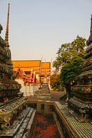 Derde stoepaanzicht van het sierlijke dak geflankeerd door delen van de chedi's van het Wat Pho Boeddha-tempelcomplex in de wijk Phra Chedi Rai, Bangkok, Thailand.