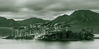 Een digitale olieverf bewerking, met groene tinten, van een een avond bij Derryclare Lough, gelegen in de Connemara in County Galway in het westen van Ierland.