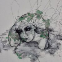 Een figuratief schilderij van zwart draad, houtskool, verf & Akebia Quinata.