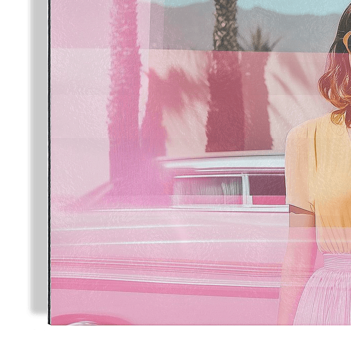 Stap in een dromerige wereld van zon, palmbomen en vintage flair met Desert Dreaming. Dit kunstwerk vangt de essentie van een ontspannen roadtrip door een zomers landschap. Een stijlvolle vrouw met een retro zonnebril straalt elegantie uit, omgeven door een klassieke auto, hoge palmbomen en een warme woestijnachtergrond. De roze gloed…