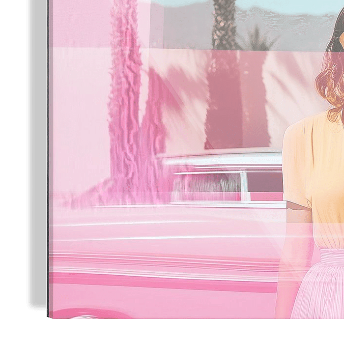 Stap in een dromerige wereld van zon, palmbomen en vintage flair met Desert Dreaming. Dit kunstwerk vangt de essentie van een ontspannen roadtrip door een zomers landschap. Een stijlvolle vrouw met een retro zonnebril straalt elegantie uit, omgeven door een klassieke auto, hoge palmbomen en een warme woestijnachtergrond. De roze gloed…