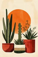 Een stijlvolle minimalistische illustratie van drie verschillende cactussen in terracotta en beige potten, geplaatst tegen een warme oranje zonsondergang. De compositie straalt rust en harmonie uit door het gebruik van aardse tinten en geometrische vormen, perfect passend in de moderne botanische interieurtrend.