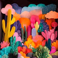 Een driedimensionaal papiersculptuur kunstwerk van een cactuswoestijnlandschap, gemaakt van gekleurd getextureerd karton in een isometrisch aanzicht wat een visueel aantrekkelijke compositie creëert.