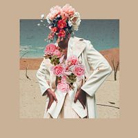 Een boho etnische stijl landschap compositie met moderne portret elementen van een Afro-Amerikaanse vrouw met rozen in neutrale beige en zand kleuren.
