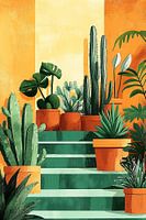Een sfeervolle illustratie van een groene trap omringd door diverse woestijn- en tropische planten in terracotta potten. De combinatie van warme oranje muren en turquoise traptreden creëert een moderne, Zuid-Amerikaanse ambiance. Cactussen, monstera's en andere bladplanten vormen een harmonieus geheel in deze botanische compositie.