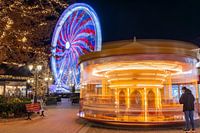Deze sfeervolle foto toont een verlichte kerstavond in Designer Outlet Roermond. De carrousel straalt warme gouden tinten uit terwijl hij in beweging is, met het kleurrijke reuzenrad op de achtergrond dat een dynamisch en feestelijk beeld creëert. De prachtige kerstverlichting en versieringen geven de omgeving een gezellige en…