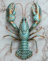 Prachtige turquoise kreeft van bovenaf gezien op een marmeren achtergrond. Dit werk past perfect in een keuken of woonkamer van fijnproevers.