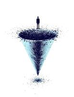 Een afbrokkelende, omgekeerde kegel symboliseert de marketing- en verkooptrechter. Een zakenman staat bovenaan en symboliseert de uitdagingen en conversieproblemen bij digitale marketing.