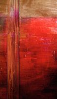 Abstracte mixed media kunst in voornamelijk rood en goud bruine tinten met grove penseelstroken op canvas.