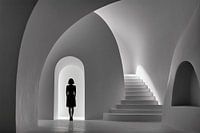 Een kunstwerk met het silhouet van een vrouw die staat in een zacht verlichte, minimalistische architectonische ruimte, gekenmerkt door vloeiende rondingen en scherpe hoeken. Ze staat voor een opening met een boog en staat symbolisch voor een onbekende toekomst of een nieuw begin. De scène is weergegeven in monochroom, wat het spel van…