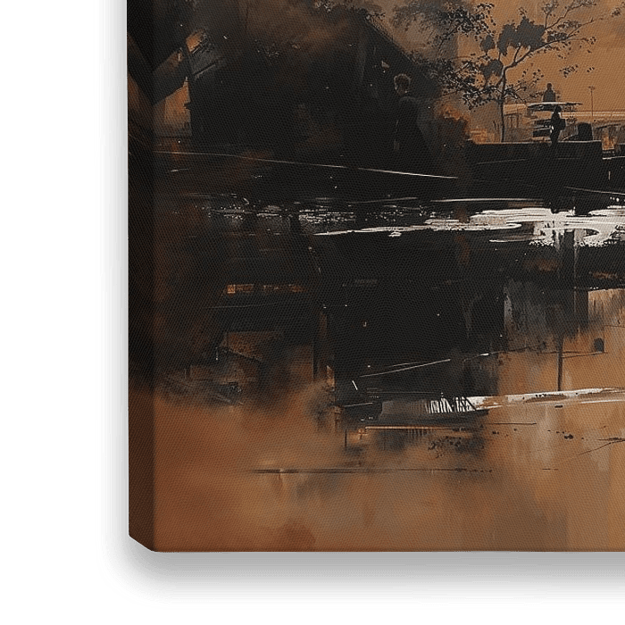 Een stijlvol kunstwerk van een vrouw in een elegante rok. De compositie benadrukt haar silhouet tegen het stadsbeeld in zachte beige tinten, wat een gevoel van mysterie en elegantie creëert. De schilderstijl heeft een beige kleurenpalet, impressionisme en zacht licht.