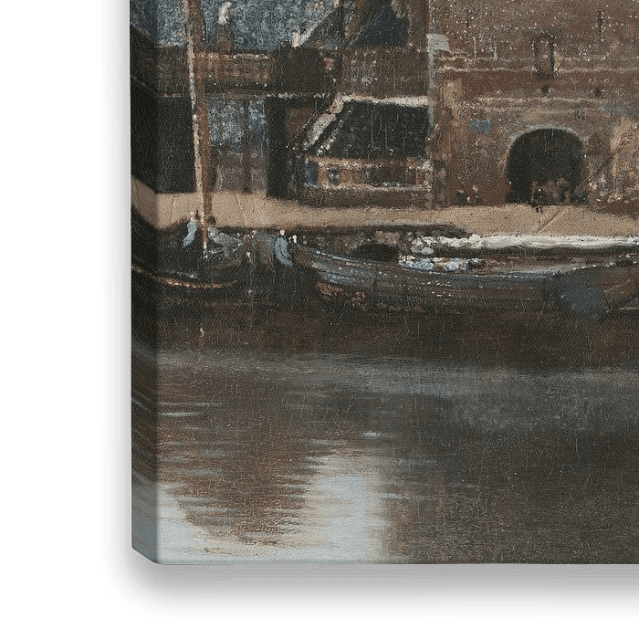 Detail uit Gezicht op Delft. Gezicht op Delft is een van de beroemdste schilderijen van de 17e-eeuwse Nederlandse meester Johannes Vermeer. Dit kunstwerk is een uitsnede van het originele kunstwerk en zoomt in op een detail van Delft.