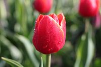 Mooie rode tulp als detail foto. Deze foto is in de ochtend gemaakt. Je ziet de dauwdruppels nog op de bloem. De zon kwam net door bij het maken van deze foto dus na een uurtje waren deze druppels al weer verdampt.