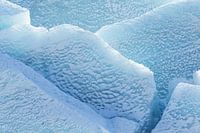 Ingezoomd op de uitlopers van de Vatnajökull zie je hele rijen gletsjerijs achter elkaar. De typisch blauwe kleur komt door de druk in het ijs. Des te hoger de druk des te blauwer de kleur. Dit detail is van de gletsjertong Svínafellsjökull.
