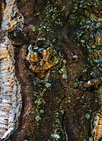 Dit is een detail van de stam van een kurkboom, gefotografeerd in Zuid Frankrijk. De combinatie van structuur van de boomschors, het reepje kurk en de groene algen vond ik een mooi geheel.