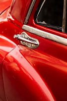 Prachtig detail van een rode oldtimer uit Cuba. Te zien is het handvat, een stuk van de zijruit en een deel van de carrosserie. Voor de echte klassieke auto liefhebber.