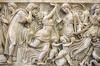 Scènes uit de mythe van Medea. Detail van de sarcofaag in het Altes Museum in Berlijn uitgevoerd in marmer.