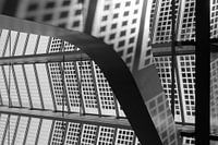 Contrastrijke foto in zwart-wit waarop een detail van de bouwkundige constructie van treinstation Rotterdam CS is te zien. Het beeld kenmerkt zich door een sterk lijnenspel in combinatie met een groot verschil in helderheid.