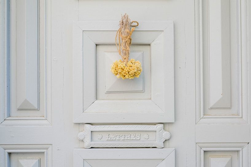 Deze foto is gemaakt in Eus, een authentiek dorp in het zuiden van Frankrijk. Het beeld toont een verfijnd detail van een klassieke lichtblauwe deur, waar eenvoud en karakter samenkomen. De geometrische vormen van het houtwerk zorgen voor een kalme compositie, terwijl het kleine bosje gedroogde bloemen een zacht, warm accent…