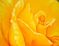Detail van een gele roos is een acrylschilderij op canvas in liggend formaat geschilderd door de kunstenaar Karen Kaspar. Het toont de binnenste bloemblaadjes van een prachtige rozenbloesem in heldere gele en oranje kleuren.