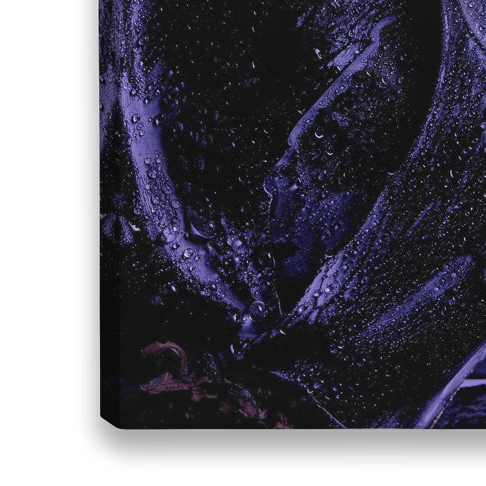 Macro-opname van een rode kool beeldvullend gefotografeerd met dauwdruppels. Een spel van donkerpaarse en blauwe kleuren, structuren en licht.