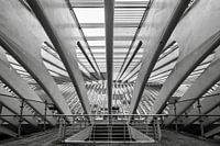 Groothoekopname in zwart wit van trap(hek) binnenin treinstation Luik - Guillemins België.