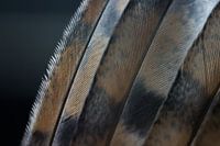 Een detailopname van de veren van de kerkuil tijdens het ringen van kerkuilen.