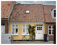 Cityscape van leuke gekleurde kleine cottage in Denemarken met fiets voor de deur