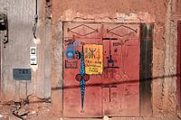 Oude kleurrijk beschilderde deur met diverse symbolen.