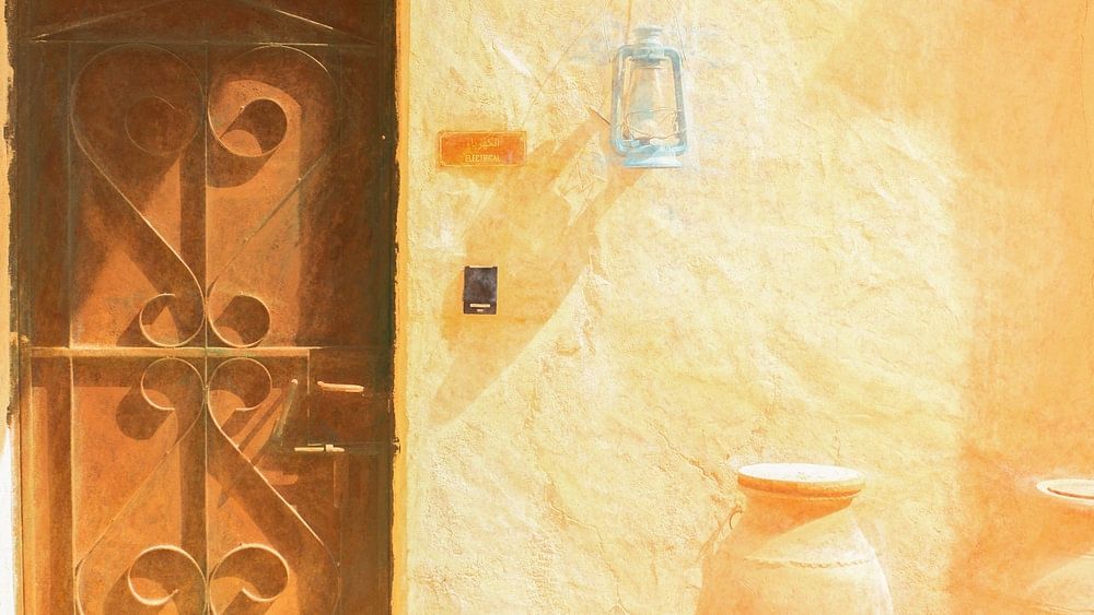 Ik stond daar, zwetend in de hitte, maar gevangen door het spel van schaduw en kleur — het contrast tussen koel bruin en warm geel, tussen verleden en heden.