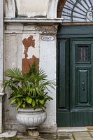 Deze scene kwam ik tegen, toen ik aan het rondstruinen was door de straatjes van Venetië. Vele gebouwen hebben mooie grote deuren, met veel details erin. Maar een grote plantenbak als deze, zie je er maar weinig.