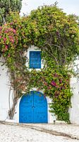 Blauwe deur met planten eromheen gegroeid in Sidi Bou Said in Tunesië.