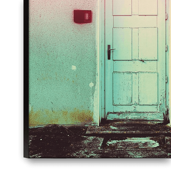 Ontdek de intrigerende charme van "Deur naar Dromen," een kunstzinnige foto die de alledaagse façade transformeert in een boeiend spel van kleur en textuur. Dit unieke beeld vangt de essentie van een verweerde deur en muur, verrijkt met een onverwacht en levendig pastelpalet van roze, turquoise en een vleugje wit.