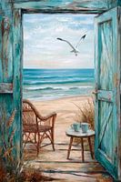 Een open hek nodigt je uit om te dagdromen, in gedachten verzonken, terwijl zachte golven het strand omspoelen. Een eenzame stoel met twee kopjes staat klaar, alsof de tijd heeft stilgestaan. Een meeuw zweeft erboven en symboliseert vrijheid en lichtheid. Hier drijven alledaagse zorgen weg in het geluid van de zee.
