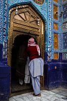 Man die door een mausoleum binnenstapt om te gaan bidden in Pakistan