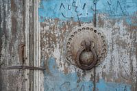 Een close-up van een traditionele deurklopper op een houten deur in de grote bazaar in Kerman. De verf op de deur is afgebladderd.