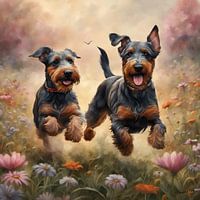 Dit levendige en grillige digitale kunstwerk vangt de vreugde van een Deutscher Jagdterrier die speelt in een veld vol wilde bloemen. De hond's speelse uitdrukking en energieke lichaamstaal zijn perfect vastgelegd, en de heldere en vrolijke kleuren van de bloemen creëren een gevoel van geluk en zorgeloos plezier.