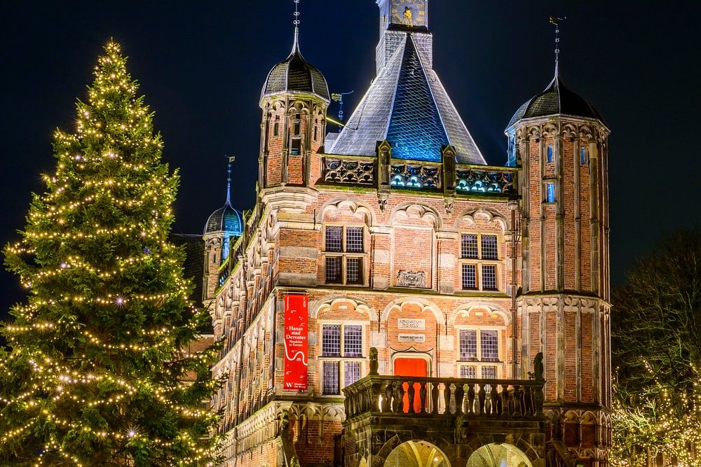 Deventer winteravond straatbeeld op het Brinkplein met het oude Waaggebouw en kerstversieringen in de oude stad die bekend staat om het jaarlijkse Dickensfestival in de dagen voor Kerstmis.