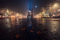 De Deventer Brink in dichte mist. De maan schijnt mooi boven de Waag.