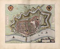 Oude kaart, plattegrond, index en wegenkaart van de stad met de verdedigingswerken, wateren, pleinen en markten. Verder de kerken, windmolens en stadsmuur of stadswal.