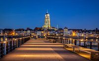 De skyline van de Hanzestad Deventer gezien in de avond en het blauwe uur, vanaf de overkant van de IJssel, over de pier. We zien de kade en de toren van de Lebuinuskerk.