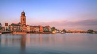 Zonsondergang in Deventer (gemeente Salland) aan de rivier de IJssel in provincie Overijssel. Met blik op de Lebuïnuskerk en de Wilhelminabrug.