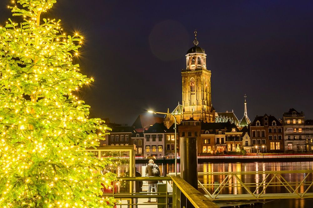 Over "Deventer skyline aan de IJssel met een kerstboom"