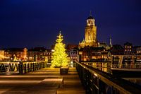 Nachtelijk uitzicht op de stad Deventer gelegen aan de oevers van de rivier de IJssel in Overijssel, Nederland in de donkere decemberdagen voor Kerstmis. De toren van de St. Lebuinuskerk of Grote Kerk is een herkenningspunt in het centrum van de stad.